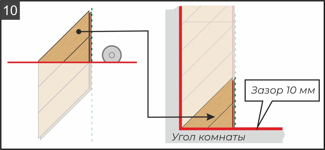 9.2. Отрежьте край ряда по указанной на рисунке красной линии (она формируется в зависимости от левого угла комнаты). Исходя из расчетов (см. рисунок 5) при необходимости подрежьте плашки по длине. В зависимости от типа пилы, которую вы используете, разберите плашки и отпилите каждую по отдельности или сделайте это уже в сборке, предварительно наметив линию при помощи угольника и карандаша.