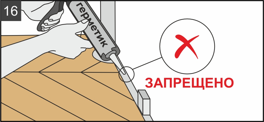 10.6. Остатки строительных материалов, мусора, клиньев в деформационных зазорах будут препятствовать линейному расширению кварцевого паркета, поэтому по окончании монтажа напольного покрытия необходимо полностью очистить деформационные зазоры (рис. 16).