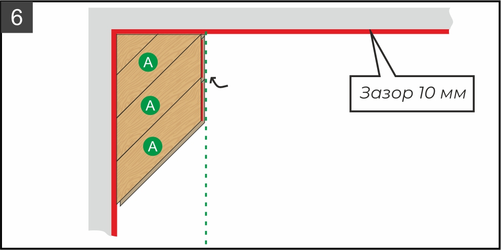 6.1. Основные монтажные деформационные зазоры необходимо предусмотреть в местах стыка края покрытия и стен, а также в местах стыка с другими напольными покрытиями и всеми выступающими из основания пола конструкциями и элементами (трубами, дверными и оконными рамами, лестницами, колоннами, перегородками, порогами, любыми крепежными элементами и недвижимыми элементами мебельных конструкций, кухонь и кухонных островов, встроенной мебели и т.п.).